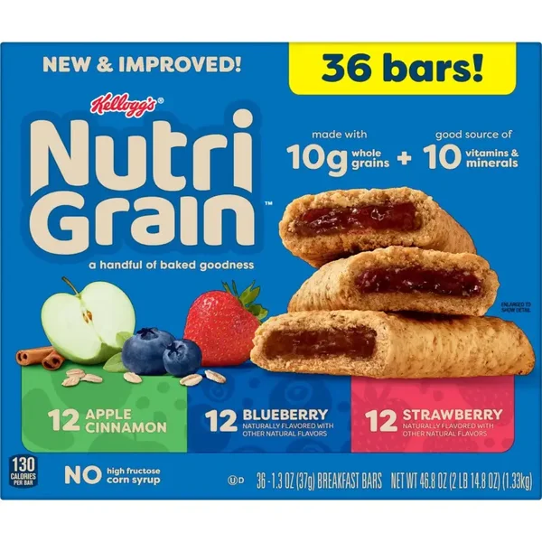 Kellogg's® Nutri Grain Bars Variety Pack (1.3 oz. bar, 36 ct.) provides 12 each of the Apple Cinnamon, Blueberry and Strawberry flavors for a quick morning meal or mid-day snack. Enjoy a delicious Nutri Grain bar with eight grams of whole grains, real fruit and no high fructose corn syrup. Each bar is made without artificial colors. The convenient packaging makes these bars perfect to store in a bag, backpack, lunch bag or office desk drawer.
