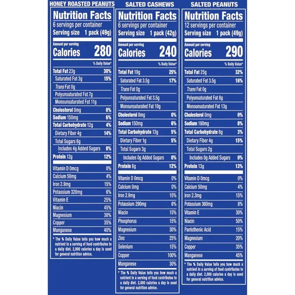 Planters Peanuts and Cashews Variety Pack offers a delightful mix of flavors to satisfy any craving. This multi-pack contains three distinctive flavors of crunchy roasted nuts: Salted Cashews, Salted Peanuts, and Honey Roasted Peanuts. The variety ensures there's always a flavor to suit your preference.