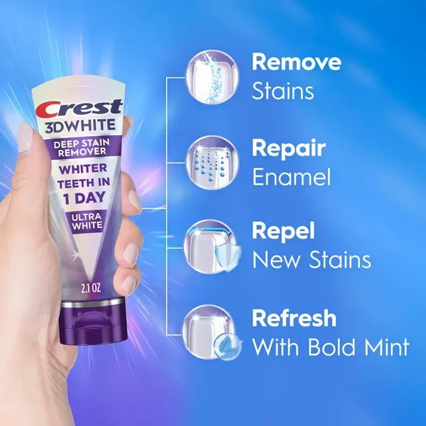 From the #1 teeth whitening brand in America. Did you know? Over time, stains build up on teeth and get harder to remove. Crest 3DWhite Deep Stain Remover Whitening Toothpaste brings together over 50 years of Crest research to deliver a whitening toothpaste that removes deep stains* for whiter teeth in 1 day.