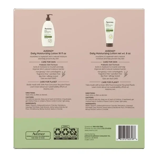 Aveeno Daily Moisturizing Body Lotion with Prebiotic Oat formula intensely nourishes dry skin. Formulated with a soothing prebiotic oat, the fragrance-free lotion has been clinically proven to moisturize for up to 24 hours. This daily body lotion nourishes and helps replenish skin's natural moisture barrier. The unique prebiotic oat formula absorbs quickly and nourishes dry skin with moisture, leaving your skin soft, beautiful and healthy-looking.