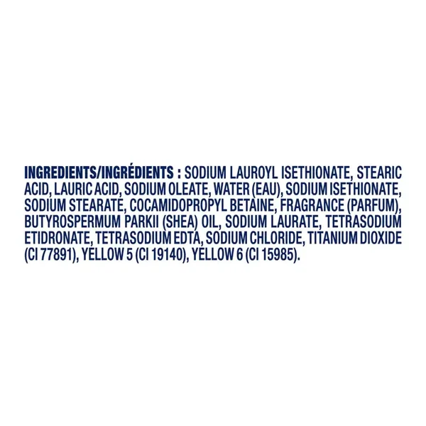 Ingredients: Sodium Lauroyl Isethionate, Stearic Acid, Lauric Acid, Sodium Tallowate or Sodium Palmitate, Water (Aqua), Sodium Isethionate, Sodium Stearate, Cocamidopropyl Betaine, Fragrance (Parfum), Sodium Cocoate or Sodium Palm Kernelate, Butyrospermum Parkii (Shea Butter) Oil, Sodium Chloride, Propylene Glycol, Tetrasodium Etidronate, Tetrasodium EDTA, Titanium Dioxide (CI 077891), Yellow 5 (CI 19140), Yellow 6 (CI 15985)