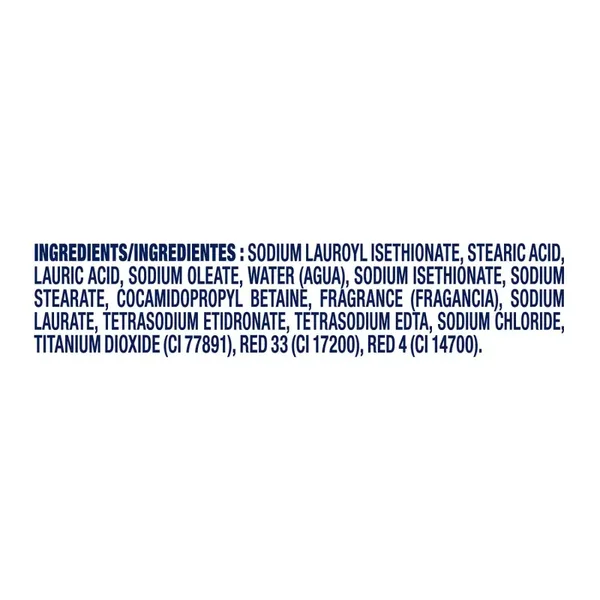 Sodium Lauroyl Isethionate Stearic Acid , Sodium Tallowate and/or Sodium Palmate, Sodium Isethionate, Lauric Acid, Water, Sodium Stearate, Cocamidopropyl Betaine, Sodium Cocoate or Sodium Palm Kernelate, Fragrance, Sodium Chloride, Propylene Glycol, Tetrasodium EDTA, Tetrasodium Etidronate, Red 4, Red 33, Titanium Dioxide.