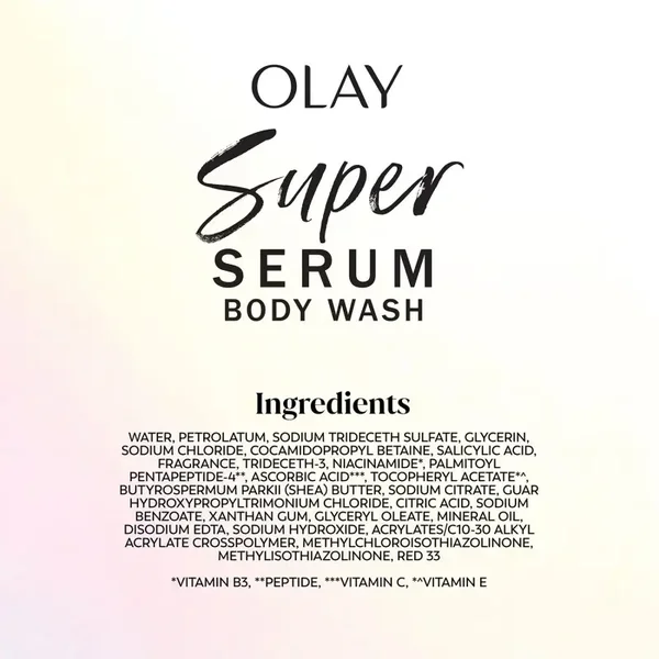 Feel the difference Olay Super Serum Body Wash can make for your skin. See and feel the difference of 5+ ingredients as they work to brighten, even, and firm skin for an ultra-luminous look. Hydrate your skin for 24 hours and experience how skin care ingredients, moisturizers, and our advanced skin-delivery technology can noticeably improve skin. Stock up and make less trips with this Olay Super Serum Body Wash 2-pack.