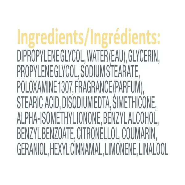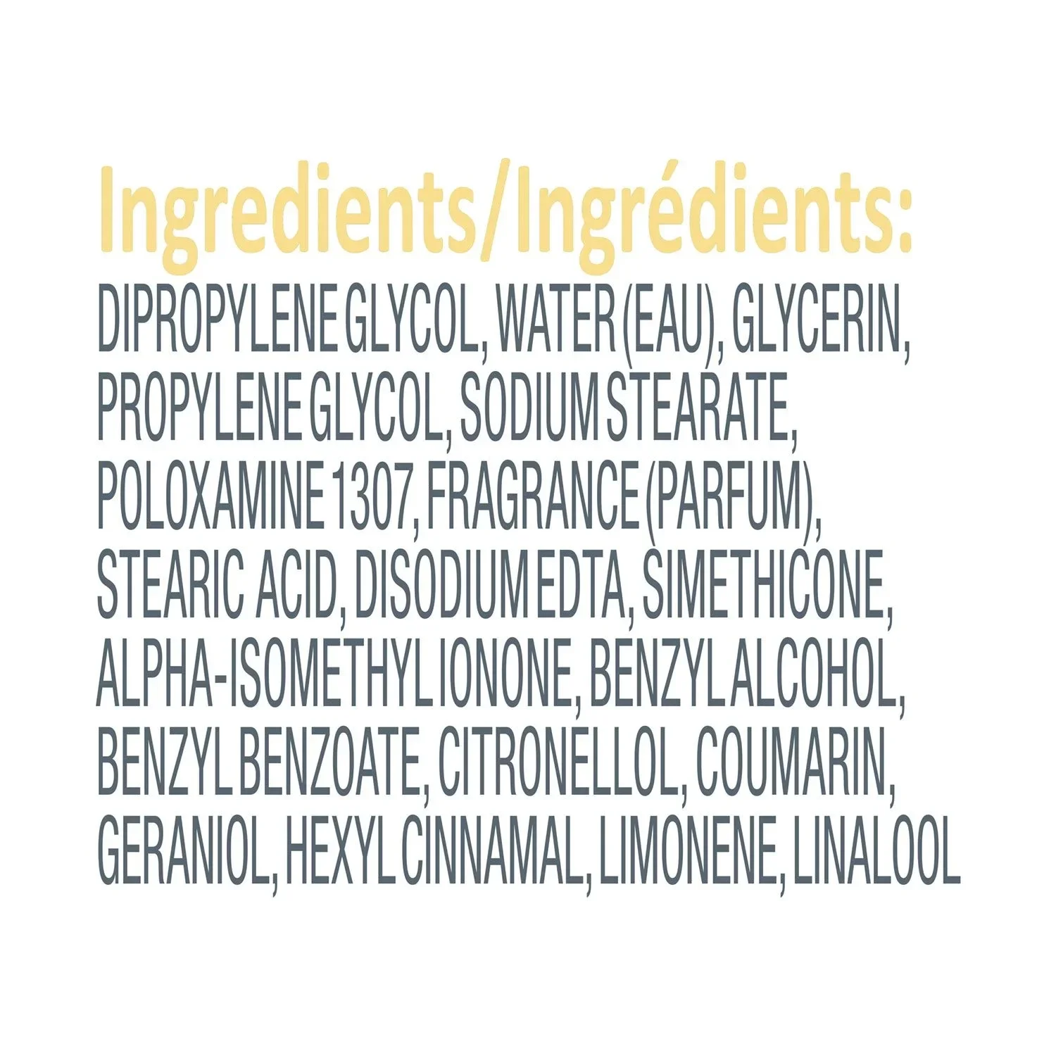 Ingredients: Dipropylene Glycol, Water (Aqua), Glycerin, Propylene Glycol, Sodium Stearate, Poloxamine 1307, Fragrance (Parfum), Stearic Acid, Disodium EDTA, Simethicone, Alpha-Isomethyl Ionone, Benzyl Alcohol, Benzyl Benzoate, Citronellol, Coumarin, Geraniol, Hexyl Cinnamal, Limonene, Linalool